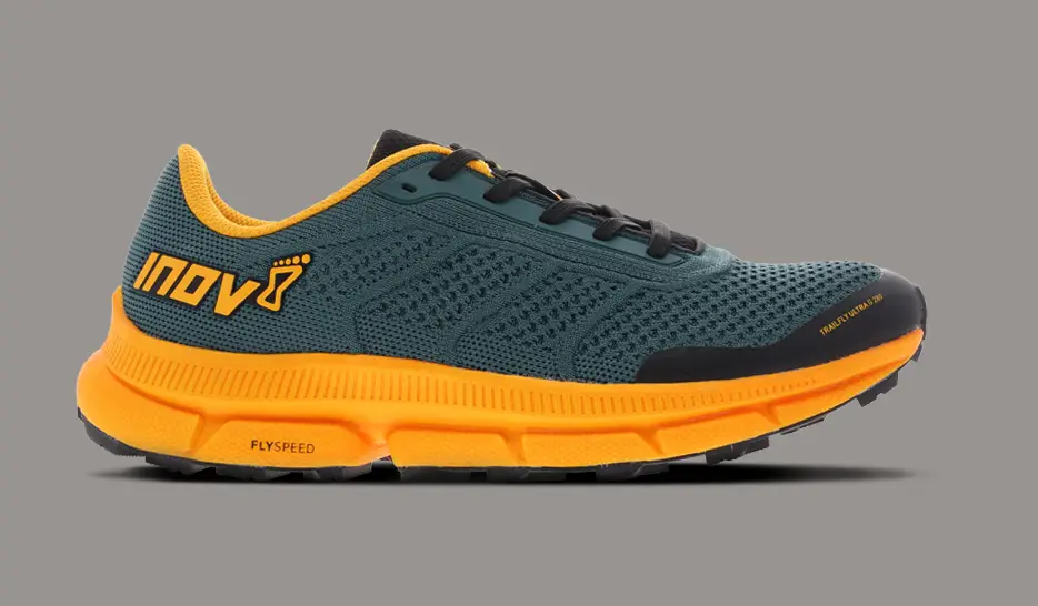 Das Design des Trailfly Ultra G 280 würde ich als schlicht, clean oder auch unaufgeregt bezeichnen. Inov-8 verzichtet auf auffällige innovative Features und liefert optisch einen „klassischen“ Laufschuh. Es gibt keine Schnellschnürung, keinen speziellen Sockenartigen Einstiegsbereich und auch kein neuartiges Zungendesign.