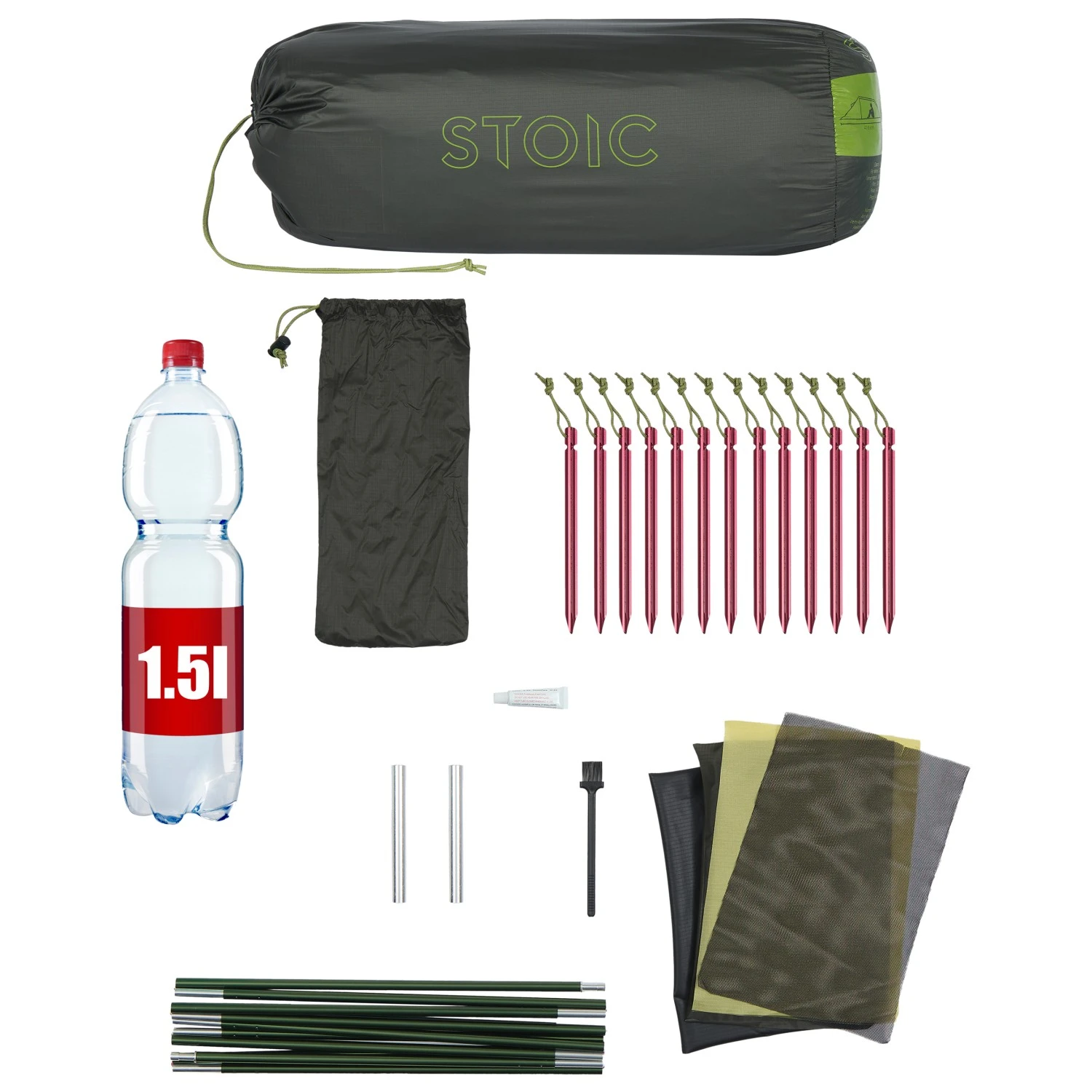 - Inklusive: Packsack; Abspannleinen; 20 Aluminiumheringe (15 cm); Reparaturset