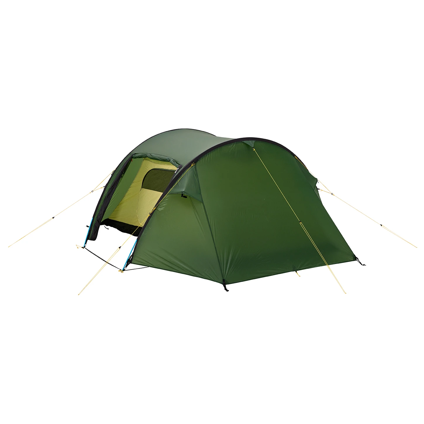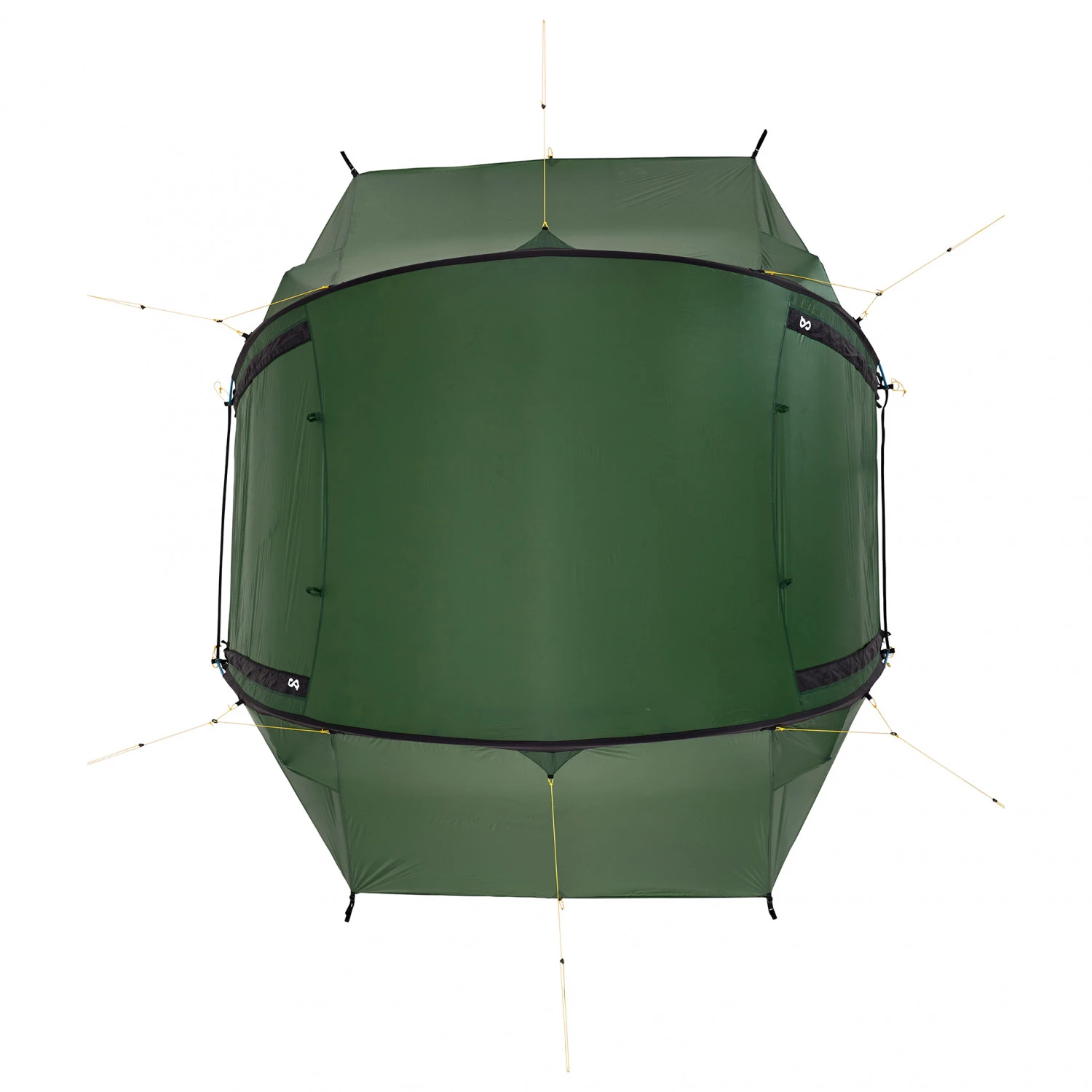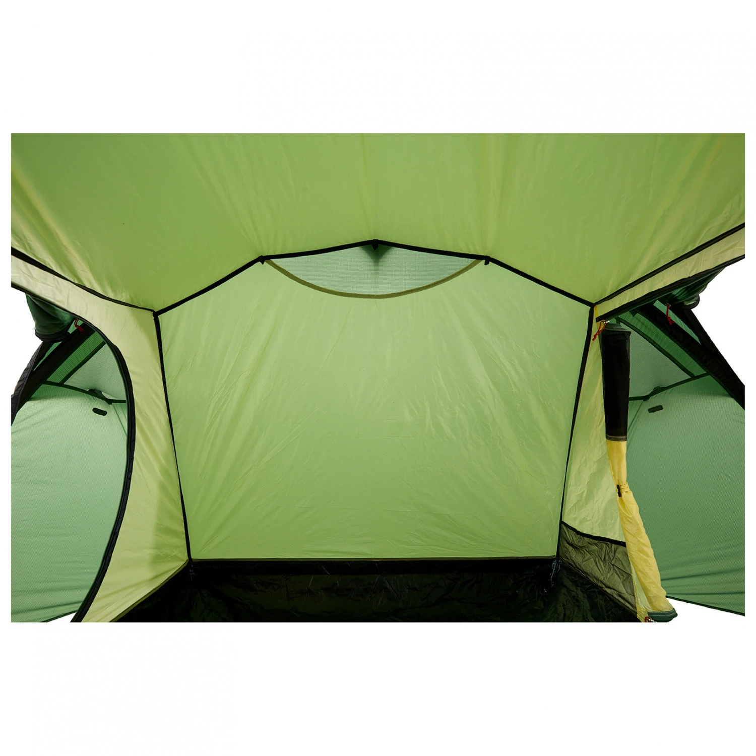 - 4 Ventilationsklappen; integrierte Netztaschen im Innenzelt; die geöffneten Türen lassen sich mit zusätzlichen Aufstellstangen als Vordach aufbauen